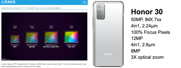 除了引领潮流的美学设计,荣耀30在拍照方面同样表现得非常出色。此前,爆料网站 slashleaks 曝光了荣耀 30 传感器的部分参数。该网站猜测,荣耀 30 系列或将采用一颗全新定制的索尼IMX传感器,传感器尺寸达到 1/1.3 英寸,单个像素面积达到1.2μm,如果爆料信息为真,那么荣耀30系列传感器将超过了目前市面上所有的产品,成为当前最大底。