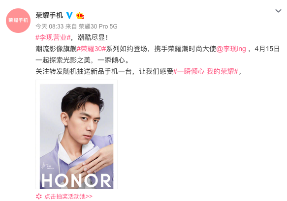 2020年春节一过,手机圈也打响了开年第一仗,不少品牌纷纷发布新机,在比拼美学设计和硬件实力的道路上互不相让,十分热闹。而最近荣耀手机也开始发力,继3月30日荣耀开年首款5G手机荣耀30S发布后,今日,荣耀手机官方疑似宣布荣耀新机。从海报来看,荣耀新机在潮流美学方面似乎有新突破,潮时尚大使李现双手持握的银色机身以及“一瞬倾心 我的荣耀”的slogan十分吸睛。
