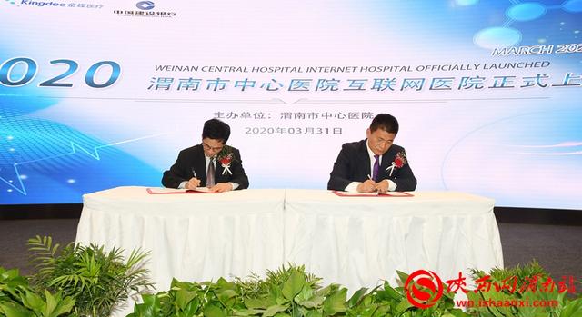 启动仪式上,渭南市中心医院网络医院代表姚建龙与渭南市药材公司代表卫红磊签署了互联网医院医联体合作协议书。