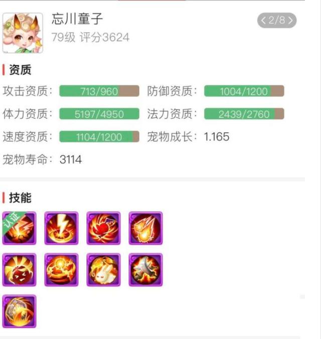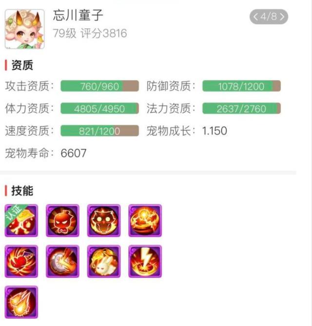 正在网友准备发表定论的时候,该玩家表示先别着急接着往下看。很快他就放出了第二只宠物,这是一只认证9技能的单法忘川童子,所拥有的1078的防御资质、4805的体力资质与2637的法力资质均接近于满属性,非常不错!唯一美中不足是1.150的成长值有些偏低。在技能配置方面所认证的是上古灵符单法技能,除了众多强化输出的技能外,还搭配了高级感知、高级精神集中、高级固法来提升生存能力,综合实力不容小觑。