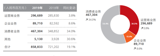分业务来看,运营商业务、消费者业务和企业业务是华为三大主营业务。年报显示,2019年,华为消费者业务营收4637亿元,同比增长34%,在总营收中占比54%,这也是华为消费者业务年度营收首次占比过半。