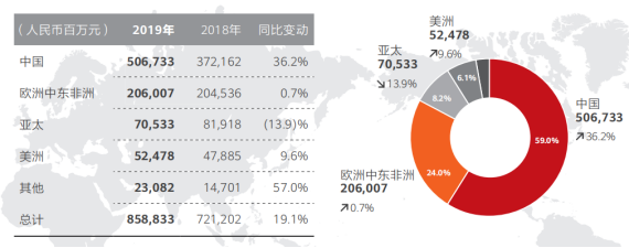 从营收地区构成来看,2019年华为中国市场实现5067亿元营收,占比59%,同比增长36.2%,美洲地区业务没有降低,反而增加了9.6%,达525亿美元,欧洲中东非洲业务贡献了2060亿元,同比增长0.7%,而亚太地区(不含中国)业务贡献了705亿元,同比下滑了13.9%,表明美国限制下,华为欧洲及亚太地区业务承受了一定压力。2018年,华为总营收7212亿元,其中中国市场实现营收3722亿元,占比52%,华为中国业务占比正逐渐提升,而海外业务占比有所下降。