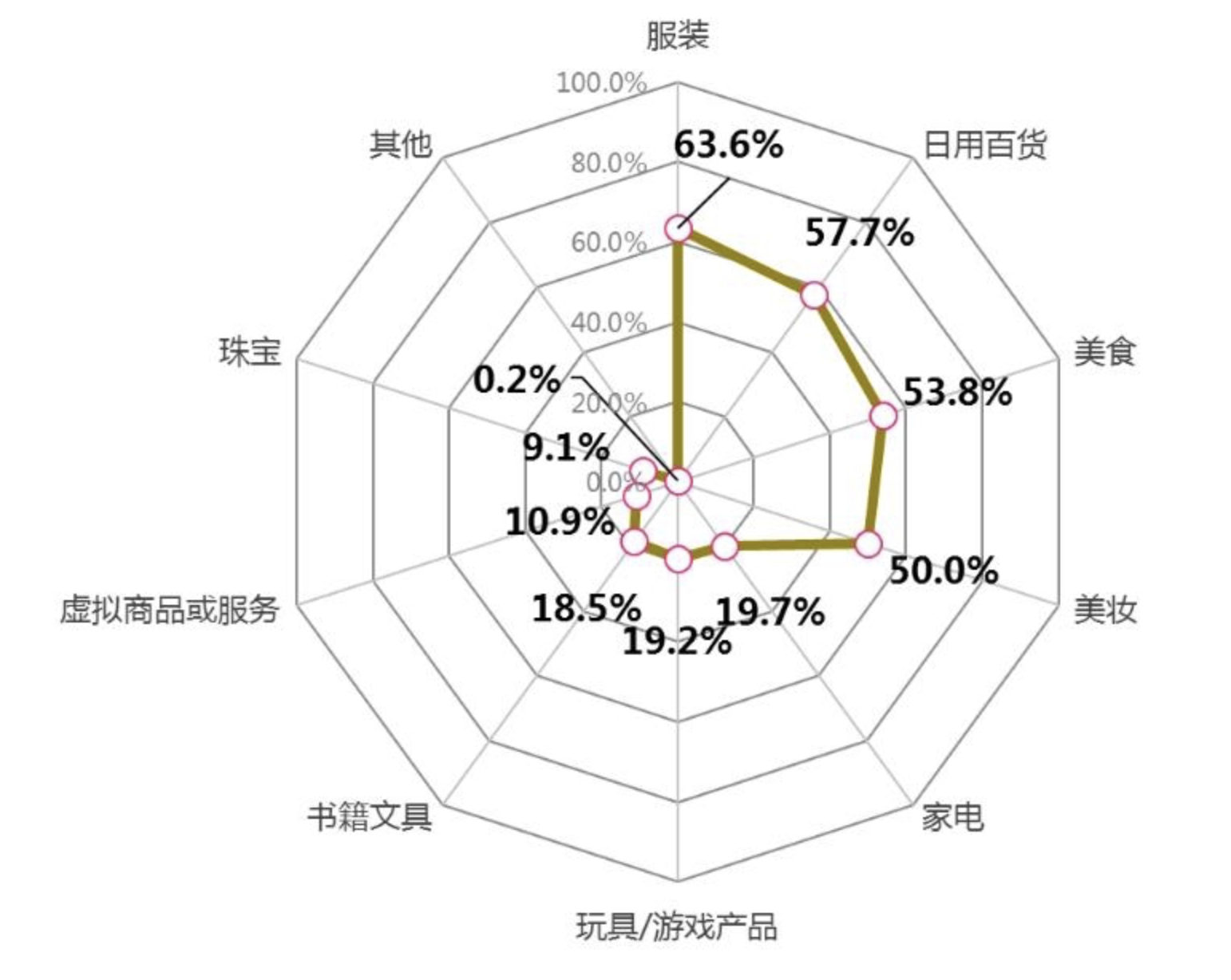 消费者观看直播购物,都喜欢看什么内容?消费者最容易被“幽默搞笑类”和“兴趣生活记录类”内容所吸引,分别占比45.9%和44.8%。“创意特效类”和“高颜值、帅哥美女类”内容的关注度也都超过30%,可见消费者观看直播时更容易被“有趣”又“有颜”的内容吸引。从一周观看直播的时长调查结果来看,42.4%消费者观看直播时长为1-3个小时,24.9%消费者观看直播时长为4-6个小时。从直播购物品类偏好来看,消费者在直播电商购买的品类大多为服装、日用品、美食、美妆,其中选择服装的消费者最多,占比63.6%。