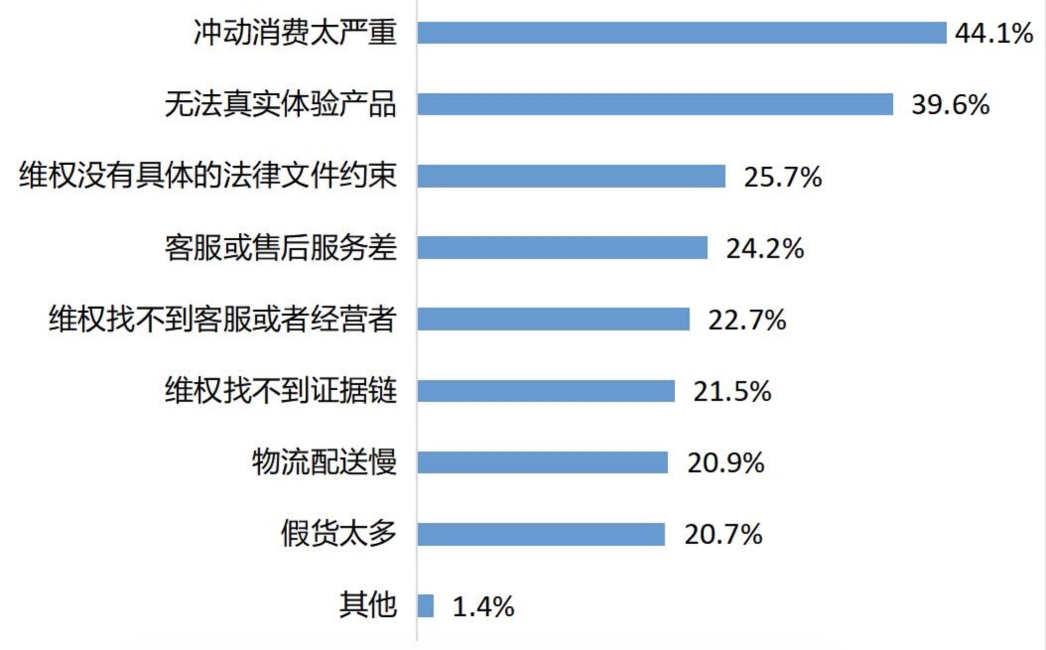从投诉渠道来看,消费者如果遇到纠纷,最直接的做法就是向直播平台管理者投诉或者向主播、经营者进行投诉;还有约23.8%的消费者会通过向消协组织进行投诉寻求支持。从直播购物遇到的问题来看,44.1%的受访者认为冲动消费比较严重,39.6%的受访者认为在观看直播时无法真实体验到商品。另外,购买商品维权也没有具体的法律文件约束,维权找不到客服或者经营者或者找不到证据链等问题均有存在。