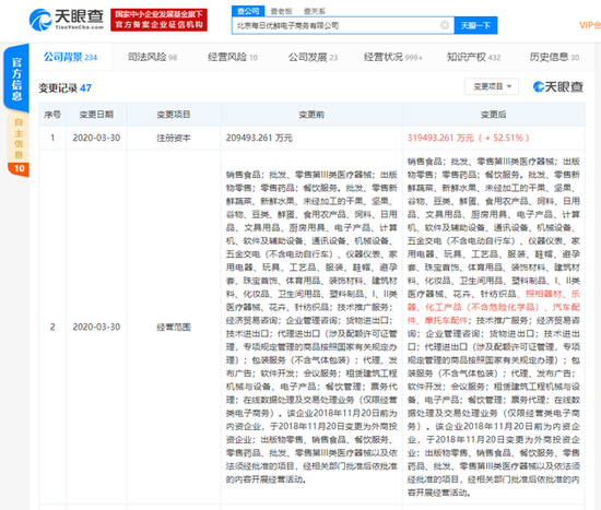 3月31日晚间消息,天眼查数据显示,3月30日,每日优鲜的运营主体北京每日优鲜电子商务有限公司发生工商变更,注册资本从约20.95亿元增至约31.95亿元,增幅达52.51%。此外,其经营范围还新增了照相器材、乐器、化工产品(不含危险化学品)、汽车配件、摩托车配件。