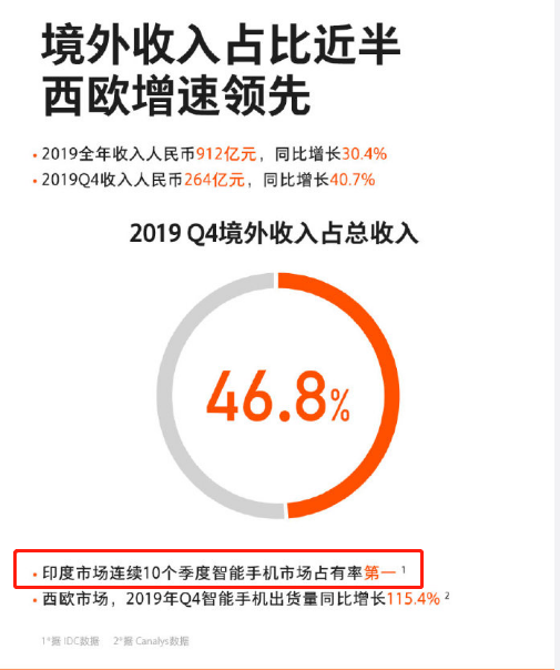 根据IDC的资料,2019年四季度,按出货量计,小米智能手机在印度连续十个季度保持出货量第一,当季市场份额约为28.7%。