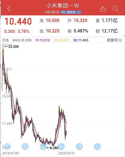 业绩虽然不错,不过从2018年7月在港股上市至今,小米集团股价整体跌落不少,最新收盘价10.44港元,较17港元的发行价跌去近40%。