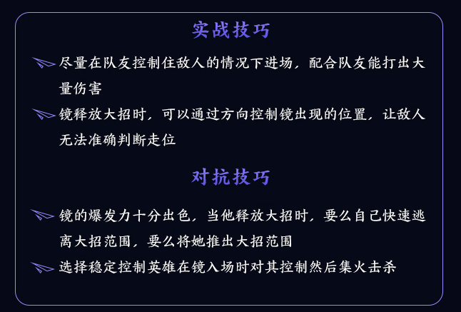 最后官方还给了镜的实战技巧和对抗技巧,说实话和其他刺客差不多,额外就是多了一个大招的要点,大家在实战中肯定就会慢慢领会到了,那么你们觉得这个英雄的强度如何呢?如果玩不来的话可以先照着官方的攻略玩玩,之后再改进也不迟。欢迎大家关注和分享,随时给你们带来王者荣耀的最新资讯心得福利等。