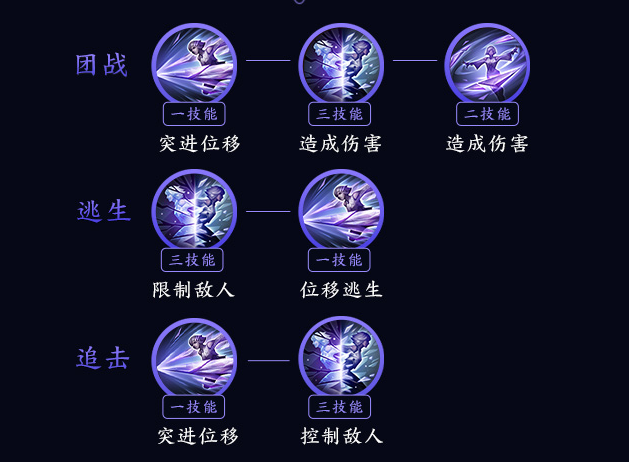 在连招方面,官方也是给出了3套,团战时候1技能切入,然后开启大招,2技能再继续打伤害,当然过程中肯定也要加一些普攻的,毕竟她可以幻化出镜子里的自己来形成双重打击嘛,而逃生的话就是开个大招就跑,看上去很合理但感觉有些浪费,很多时候还是节约一下大招的CD比较好,除非是那种被几个人追杀不开大招必死的情况。追击则是反过来了,1技能靠近之后大招控制,整体来说操作难度确实不算高。