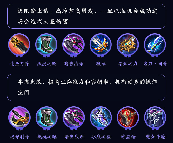 装备这里官方也是给了两套装备,并且都是打野装,但侧重点不同,第一套可以算是套纯输出装了,靠的就是一套进去秒脆皮,当然在后期的话进去了多半也回不来了,一换一如果换到核心也不会很亏,大招还能提供额外的作用,另外一套则是半肉出装,在有一定输出的同时也能承受一定的伤害,可以拉扯着打,至于到底是用哪套,还是要看双方的阵容和当时的局势啊。