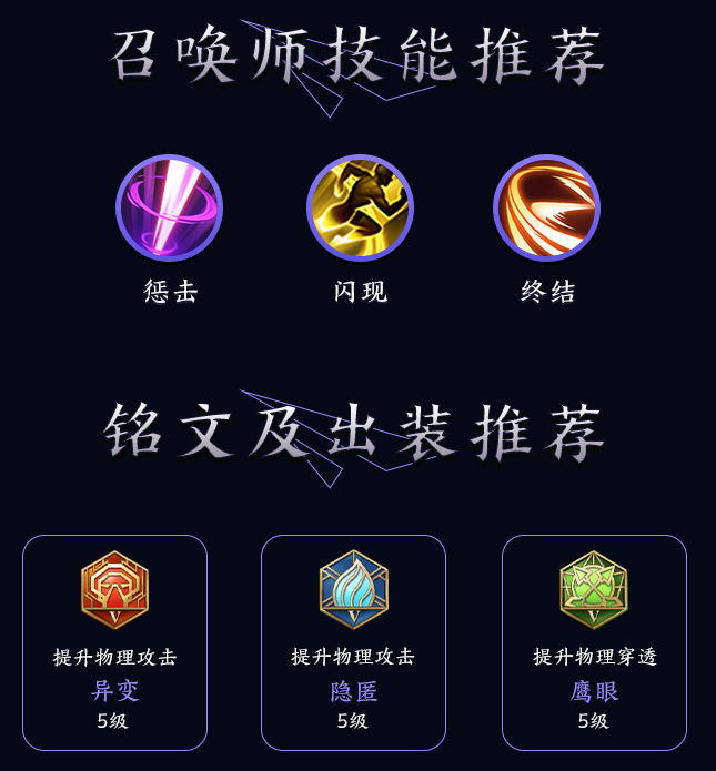 在召唤师技能的选择上,官方是直接给了3个,惩击自然是打野专属,闪现和终结则是走边路的备选,而铭文就是大家非常熟悉的百穿铭文了,可以极大的提高她的输出能力,作为一名刺客,伤害还是最主要的嘛。