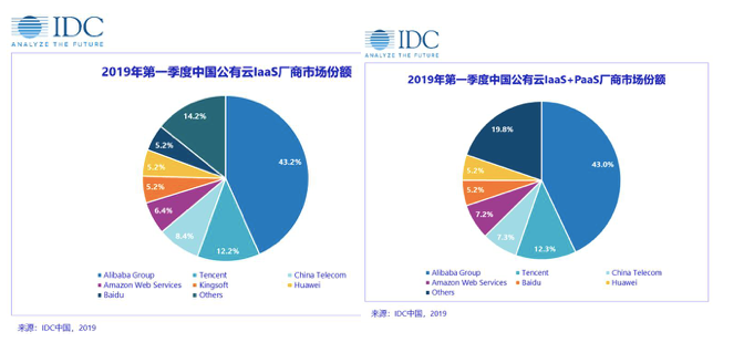 在IDC报告中,2019上半年中国公有云的IaaS(基础设施即服务)的市场份额见下图
