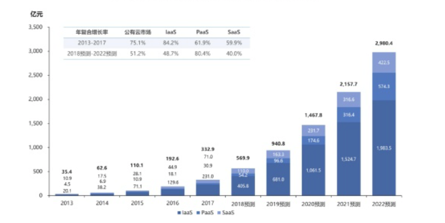 2017-2022年该机构的主要判断为:IaaS仍将保持最大份额,但速度将有所下降,SaaS维持在40%左右同比增速,PaaS增速放大。