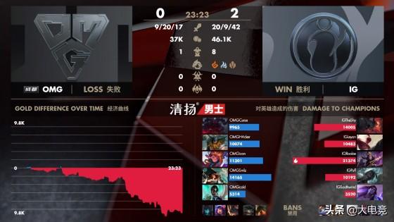 拿到大龙Buff后iG的进攻更加猛烈,而OMG只能在慌乱中尝试用机器人的Q来找回一些局面,iG则是将计就计,顺势包夹发动反击,妮蔻连环控制爆炸输出,在高地前斩获五杀!iG随后拆掉基地,以一种不可思议的方式完成了翻盘取胜,取得1:0领先!