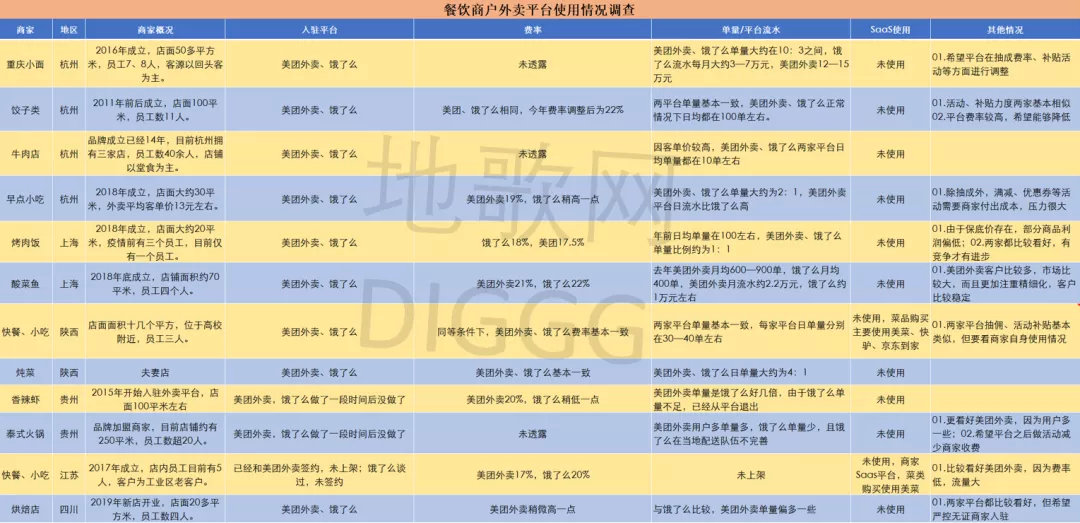 为了了解餐饮企业的外卖生存状态,以及两大平台对餐饮企业的支持力度,地歌网展开了第一次田野访谈,尽管此番尚未能够按照区域、企业类型展开较为系统、全面的调查,样本数量也没有达到广泛代表量级,但我们还是想开这样一个头,并将在近期持续关注餐饮外卖商家 ,希望能够最终对这个领域有一个“真相性”的扫描。