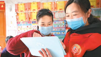 山东临沂市沂南县岸堤镇暖泉村学生张欣欣家庭生活困难,以前需要借用别人的手机参加学校开设的“空中课堂”。图为沂南县大爱沂蒙志愿服务队志愿者(右)给张欣欣送去平板电脑并教她使用。 杜昱葆摄(人民视觉)