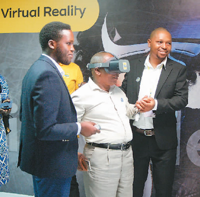 1月17日,在乌干达首都坎帕拉,用户在5G试验活动上使用VR眼镜体验5G网速。 约瑟夫·基恭杜摄(新华社发)