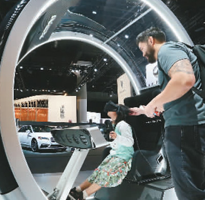 在2019年美国洛杉矶车展上,一名小女孩通过VR虚拟现实技术体验汽车驾驶。 新华社发