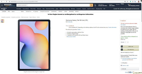 近日,三星Galaxy Tab S6 Lite在德国亚马逊上意外曝光,亚马逊页面显示(已被删除),这款全新平板产品将于2020月4月2日开启订购,但问题是三星尚未正式发布该产品。
