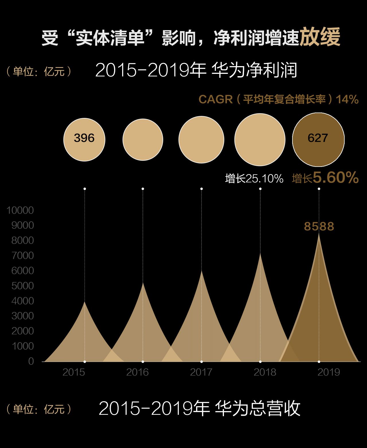 此外,华为的净利润增速也出现明显放缓,公司从2018年的25.1%下滑至去年的5.6%,营业利润率也从2018年的10.2%下滑至去年的9.1%。