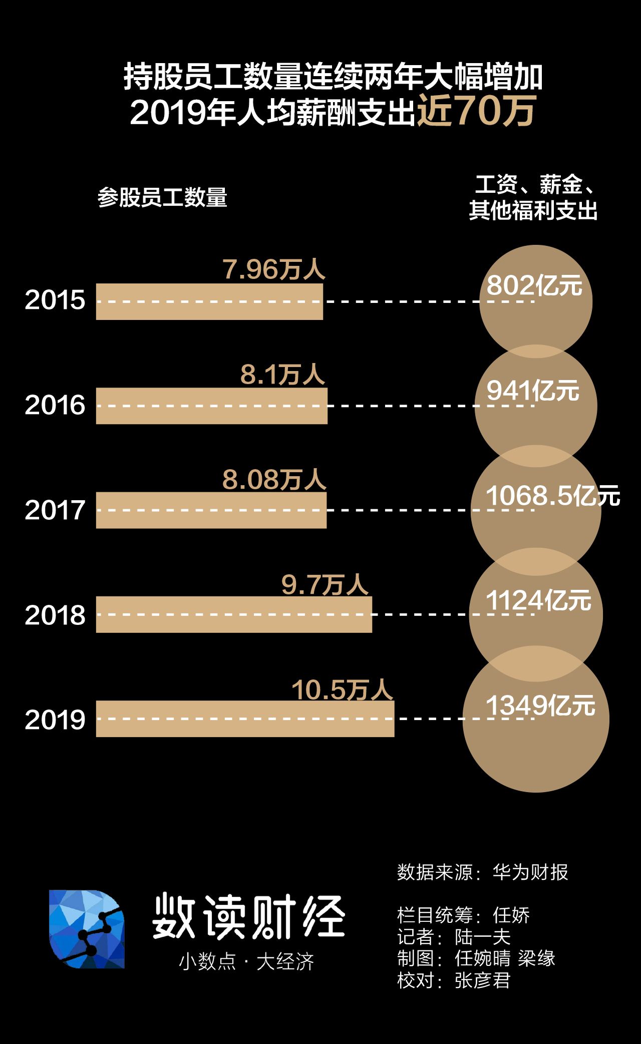 此外,华为去年在工资、薪金及其他福利上的支出达1349.37亿元,以19.4万名员工计算,华为员工人均薪酬达69.5万元。