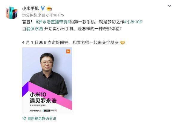 4月1日消息,前段时间罗永浩称自己于4月1日晚8:00在抖音平台开始直播带货,此消息一出,广大吃瓜网友纷纷炸了锅 ,开始猜测罗永浩究竟会为哪些品牌进行推广。而在今天上午,小米手机在其官方微博正式宣布,罗永浩直播带货的首款产品就是其最新发布的旗舰新机小米10。