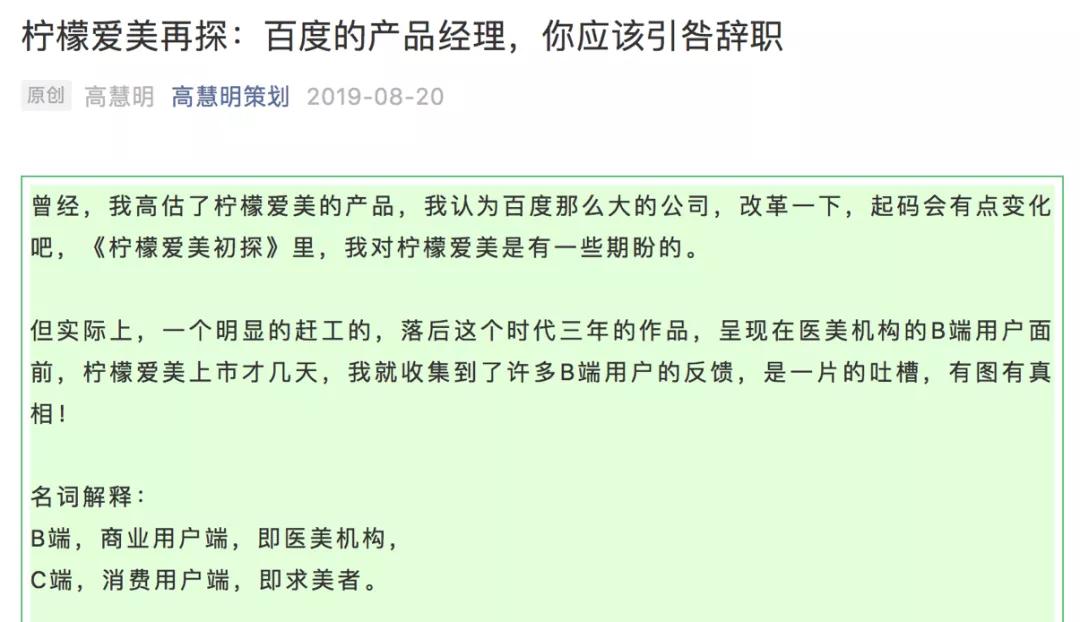但什么都有,往往意味着什么都不精。很多商家(医美机构)在试用柠檬爱美后,都给出了失望的评价。甚至有业内人实名撰文吐槽,不说投放ROI,仅从最基本的使用体验上说,这就是个落后时代三年的东西。
