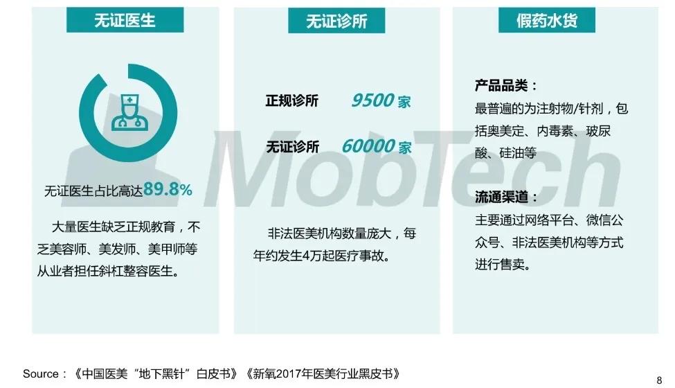 据《中国医美“地下黑针”白皮书》的数据,目前中国医美市场上的无证医生占比高达89.8%,6万家非法医美机构每年约发生4万起医疗事故。相比之下,正规诊所仅有9500家。
