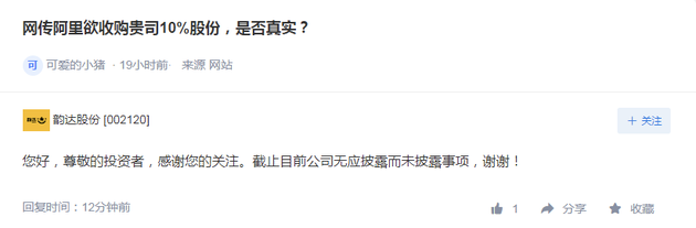 4月1日消息,针对投资者“阿里欲收购公司10%股份是否真实”的提问,韵达股份在互动平台上回应称,截止目前公司无应披露而未披露事项。