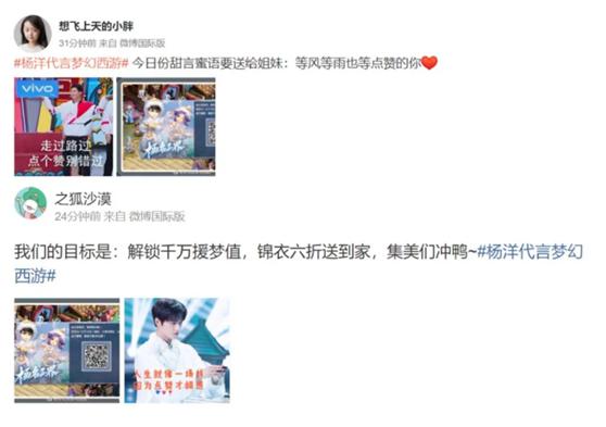 话题下随处可见杨洋粉丝与《梦幻西游》玩家的互动,你为了杨洋,我为了锦衣,虽然目标不同,但却殊途同归,那场面真实和谐又美好,爱了爱了。