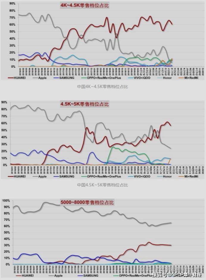 而反观同期中国本土品牌华为,其4500-5000元档位手机和5000-8000元档位手机零售占有率分别上涨41.55%和35.21%,各价位手机零售占有率综合下跌12.66%。