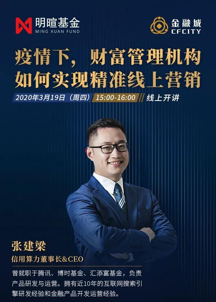 近日,信用算力CEO张建梁受邀为明暄基金进行线上直播授课,分享当前疫情下,财富管理机构如何实现精准线上营销。本次课程内容丰富,干货满满,吸引了超千人次观看,授课内容主要从疫情对经济和个人财富的影响,到财富管理结构的数字化营销布局与线上营销风险管控,以及财富管理市场的变革与线上营销趋势,张建梁进行了解读与个人研判。