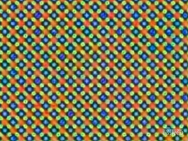 通过微距模式拍照并放大,我们可以比较清楚地看到手机屏幕的像素排列方式。