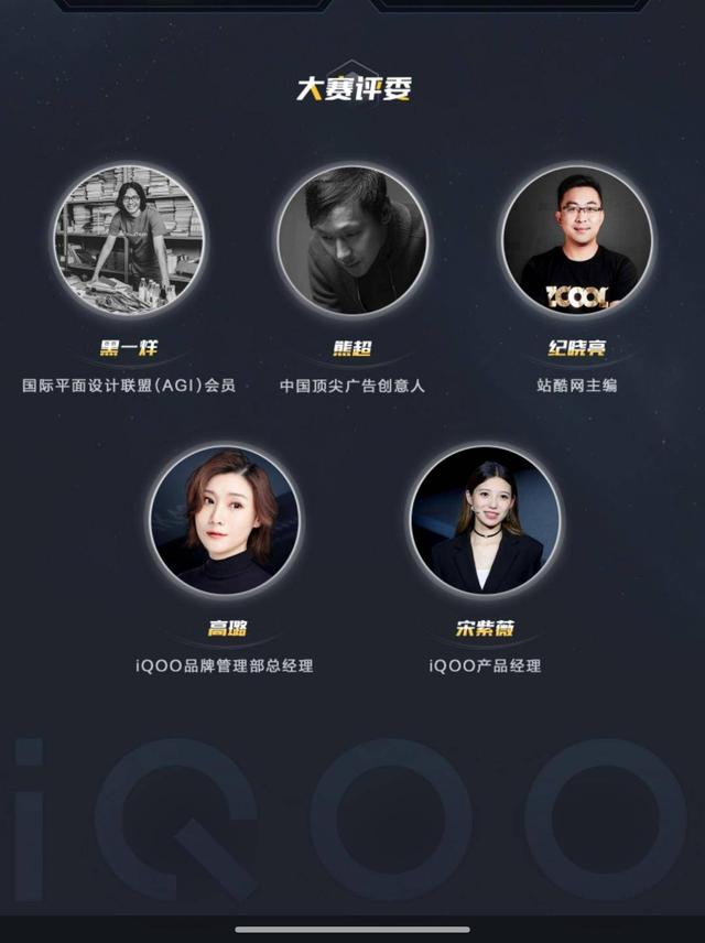 iQOO为此次大赛邀请了五位重量级人物作为评委,其中包括iQOO品牌管理部总经理高璐、iQOO产品经理宋紫薇,还有站酷网主编纪晓亮,同时还有国际平面设计联盟会员黑一烊以及中国顶尖广告创意人熊超。可以说,有了这五位专业的评委加入,比赛的公平性和客观性具备充分的保障。每一份获奖作品都将经过精挑细选,因此参赛人员可以放心大胆地参与到这个活动中来。
