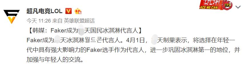 不过在四月一日,Faker传出了一则代言消息,那就是他成为某款冰淇淋的代言人。此前因为一些事情,这家公司在国内的声誉并不好,而且还遭到了多方买家的抵制。