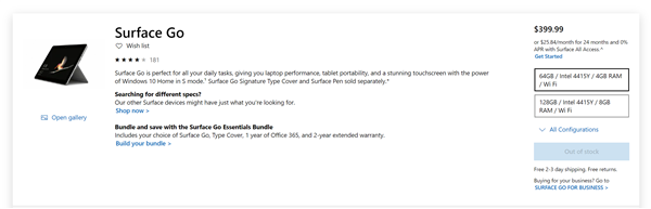 如今微软美国官网显示Surface Go已经售罄,这意味着新品Surface Go 2即将登场。