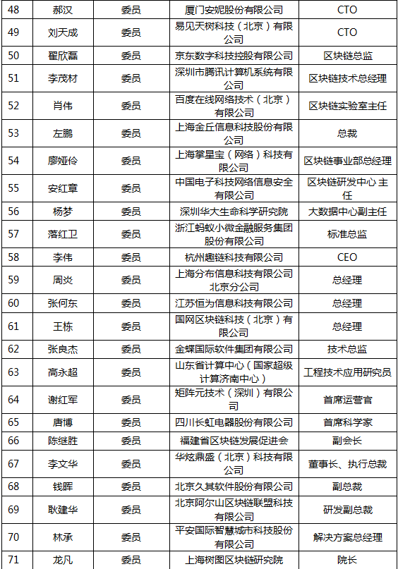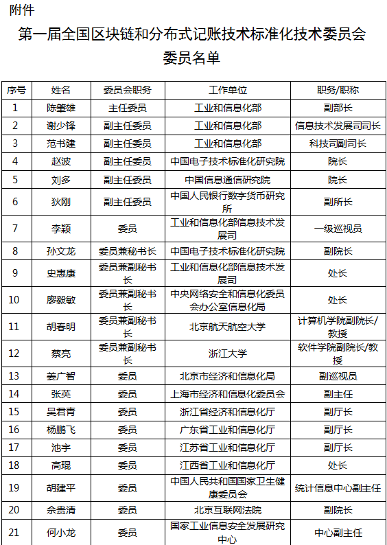 4月14日上午消息,工信部近日公示第一届全国区块链和分布式记账技术标准化技术委员会委员名单。其中工信部副部长陈肇雄任委员会主任委员,委员中包含大学教授、华为京东腾讯等公司的行业从业者。
