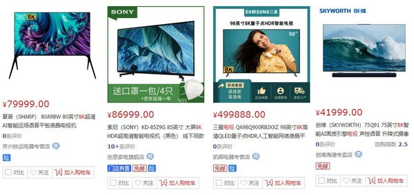 据了解,相关彩电厂商已推出各种8K机型,如三星、索尼、夏普、海信、LG和创维等品牌已经上市8K电视,消费者在京东就能买到。如三星的65英寸、75英寸、82英寸和96英寸QLED 8K电视;LG的65英寸、75英寸、77英寸和88英寸OLED机型;创维的75英寸8K智能AI画质引擎电视,以及夏普和部分中国公司的类似型号。而海尔、康佳、长虹、TCL和小米等品牌旗下的部分超高清电视支持8K解码。