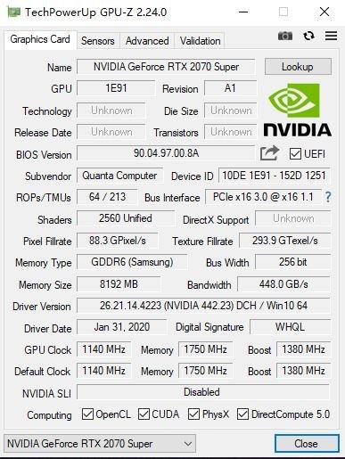 几乎与英特尔同一时间,NVIDIA正式推出了GeForce RTX 20 Super系列的移动版显卡,雷神911Pro晖金2代配置了GeForce RTX 2070 Super。根据GPU-Z信息检索可以看到,这款显卡拥有2560个流处理器、256bit显存位宽、高达8GB GDDR6显存,时钟频率1140MHz,显存频率高1750MHz,Boost频率1380MHz,相对于普通的GeForce RTX 2070独显来说,Super显卡的主要提升在于流处理器数量从2304个增加到2560个,因此在实际性能表现上也有实质性的提升。