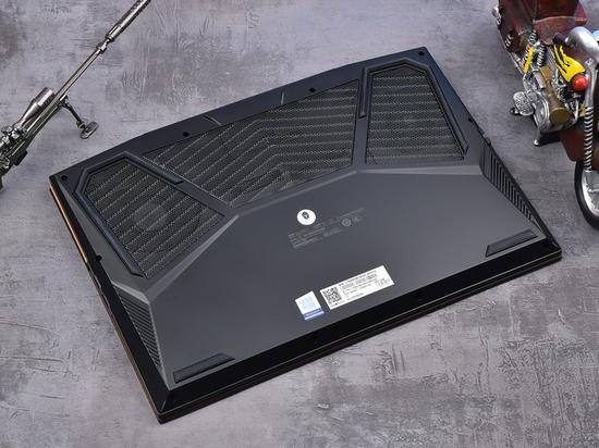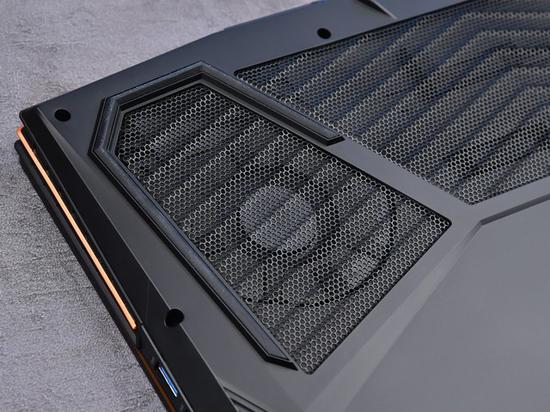 这款机器采用了四出风口设计,在机身的尾部左右两侧、机身左右侧边都配有出风口。而其内部配有71片扇叶的黑科技速冷风扇,转速最高可达7000转。其机身底部设计了大面积散热窗,系统方面支持一键开启强冷散热模式。