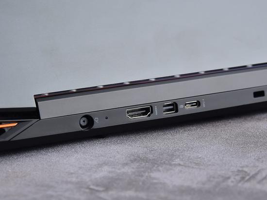 线缆比较粗的接口都被安排在了机身尾部,包括电源接口、HDMI接口、Mini DP接口,另外TYPE-C接口和安全锁孔也被设计在了尾部位置。