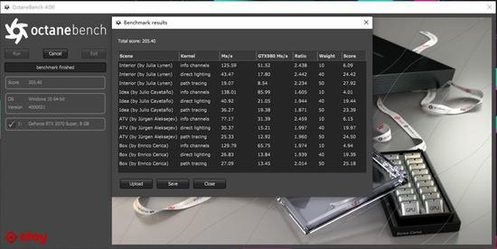 此外我们通过Octanebench对GeForce RTX 2070 Super独显的渲染性能做了评估,其最终评分为205.4分,说明其在图形渲染应用当中有着极佳的性能表现,可以帮助创意设计领域的用户高效的完成各类渲染任务。