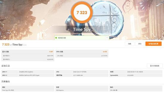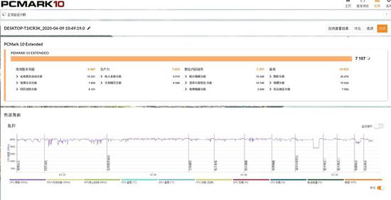 综合性能方面,我们使用PCMark 10的Extended模式对其进行了评估。从结果可以看到,雷神911Pro晖金2代在常用基本功能,包含Web浏览、视频会议、应用程序启动等得分为8687分,这个分数在目前的游戏本产品中表现非常不错;而在生产力项目测试中得分为7653分,说明其完成电子表格、文档工作没有压力;数位内容创作方面,得益于RTX 2070 Super独显的加持以及英特尔十代酷睿i7-10750H处理器出色的物理渲染能力,其评分高达7397分,说明其完成图片、视频、图形渲染等工作毫无压力;另外其游戏性能评分也达到了14023分,图形和物理分数表现均衡,应对目前所有游戏都能在高画质下提供流畅体验。
