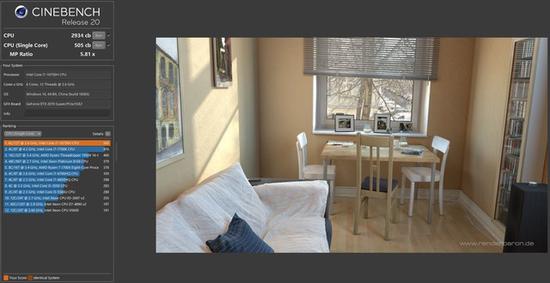 我们以CINEBENCH R15和R20测试环境为标准,在R15测试中,这颗处理器单核得分212cb,多核得分1251cb;在R20测试中,这颗处理器单核得分505cb,多核得分2934cb,整体性能较九代酷睿i7-9750H处理器有一定提升,而且在测试中明显感觉到,十代酷睿i7-10750H处理器的性能发挥更加稳定。