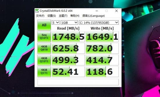 雷神911Pro晖金2代评测机型配置了1TB SSD,实测其随机读取速度为1748.5MB/s,写入速度为1649.1MB/s,性能表现不错,属于目前固态硬盘中的中高端水准。