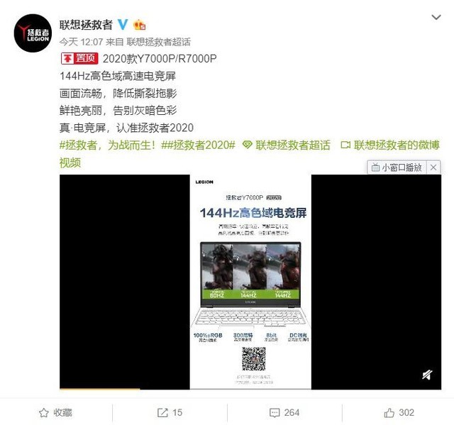 近日,联想拯救者在官方微博表示,2020款联想拯救者Y7000和联想拯救者R7000全系标配100%RGB高色域屏,对屏幕色彩和亮度表现全面进行提升,还表示将开启游戏本的高色域普及风暴。