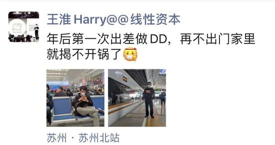 4月13日,线性资本创始合伙人王淮开始年后第一次出差之旅,在朋友圈如此调侃。