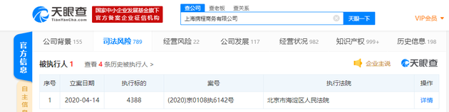 4月16日上午消息,天眼查数据显示,4月14日,上海携程商务有限公司被北京市海淀区人民法院列为被执行人,执行标的4388。