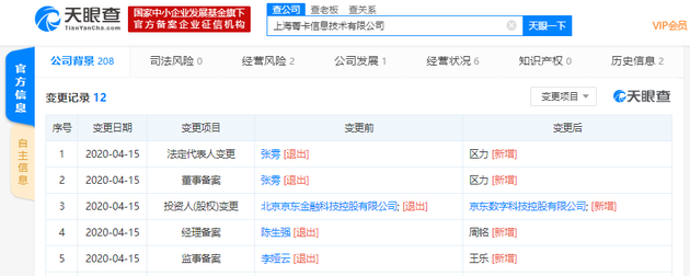4月16日下午消息,天眼查数据显示,4月15日,上海菁卡信息技术有限公司发生工商变更,京东数科CEO陈生强卸任公司经理一职,由周铭接任,张霁卸任法定代表人、董事,由京东数科副总裁区力接任,此外,李娅云卸任监事,由王乐接任。