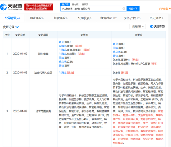 4月16日下午消息,天眼查数据显示,4月9日,TCL旗下公司——TCL新技术(惠州)有限公司发生工商变更,经营范围新增多项业务,其中涉及智能机器人、触摸一体机、交互智能平板、数字标牌产品等。此外,牛海龙卸任该公司法定代表人、董事长和总经理,张志伟接任。